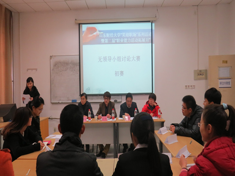 11月21日下午,由山东财经大学研究生部、金融学院主办,金融学院研究生会承办的山东财经大学第二届“职业能力活动拓展月”系列活动之“无领导小组讨论初赛”在舜耕校区研究生楼举行。此次比赛共设5个分赛场,分两轮进行,近百名同学参加了此次比赛。来自齐鲁银行、中国人民银行、青岛银行和重汽财务公司等企事业单位及部分校内专家出席并担任本次比赛评委,金融学院副处级组织员孙丽华、金融学院就业办主任及辅导员吕海霞、研究生辅导员王倩及部分在校学生到场观看了此次比赛。